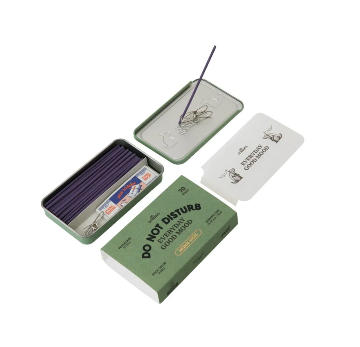 70 sticks of incense that burn for 15-20 minutes each. Sturdy metal case the can be carried anywhere. Incense clip included. Natural Ingredients. Top can be used as burning tray. Quick start guide included.